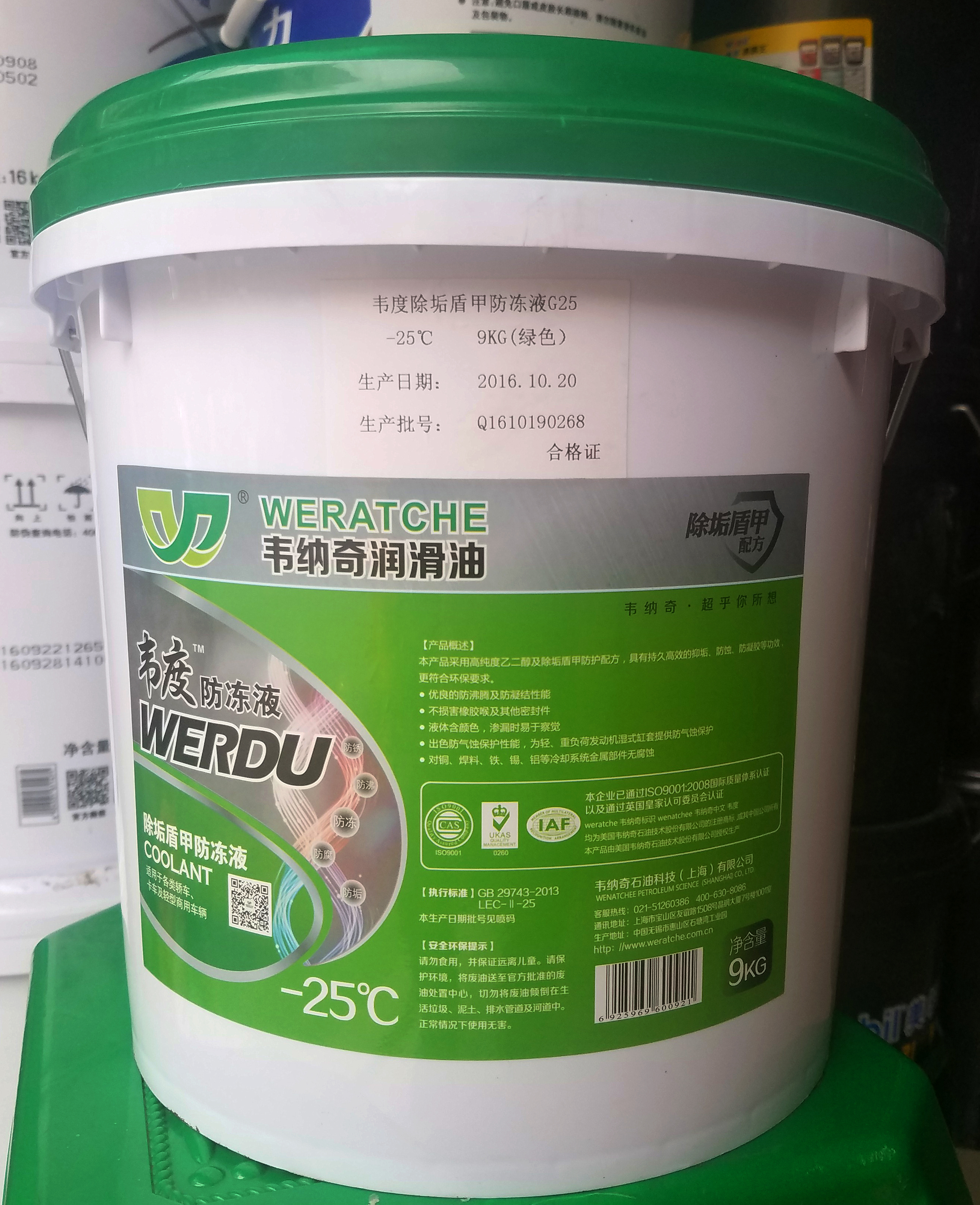 韦纳奇润滑油韦度系列除垢盾甲防冻液只要有-15℃、-25℃、-35℃和-45℃四款产品,本系列产品采用高纯度乙二醇及除垢甲防护配方,具有持久的抑垢、防蚀、防凝结等功效,更符合环保要求