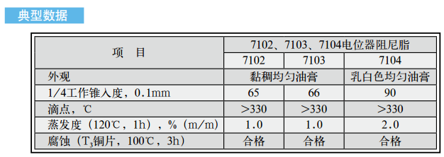 长城牌7102、7103、7104电位器阻尼脂是以无机稠化剂稠化合成油,并加入防锈、抗腐蚀添加剂和结构改善剂等精制而成。